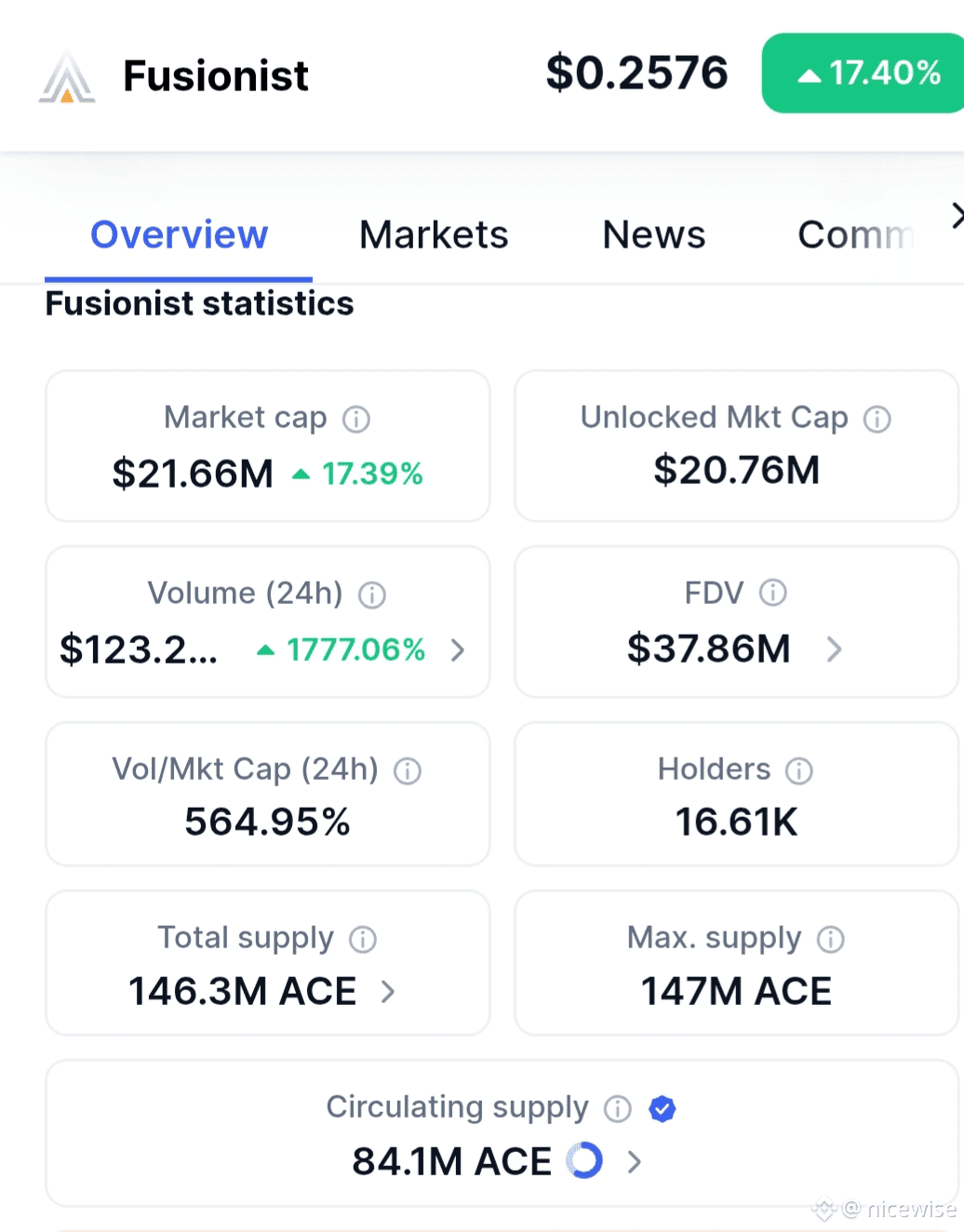 Right now the ACE coin (Fusionist ACE) is trading at around $0.2575 USD, with small price movement up from the day before. It’s not a huge market cap