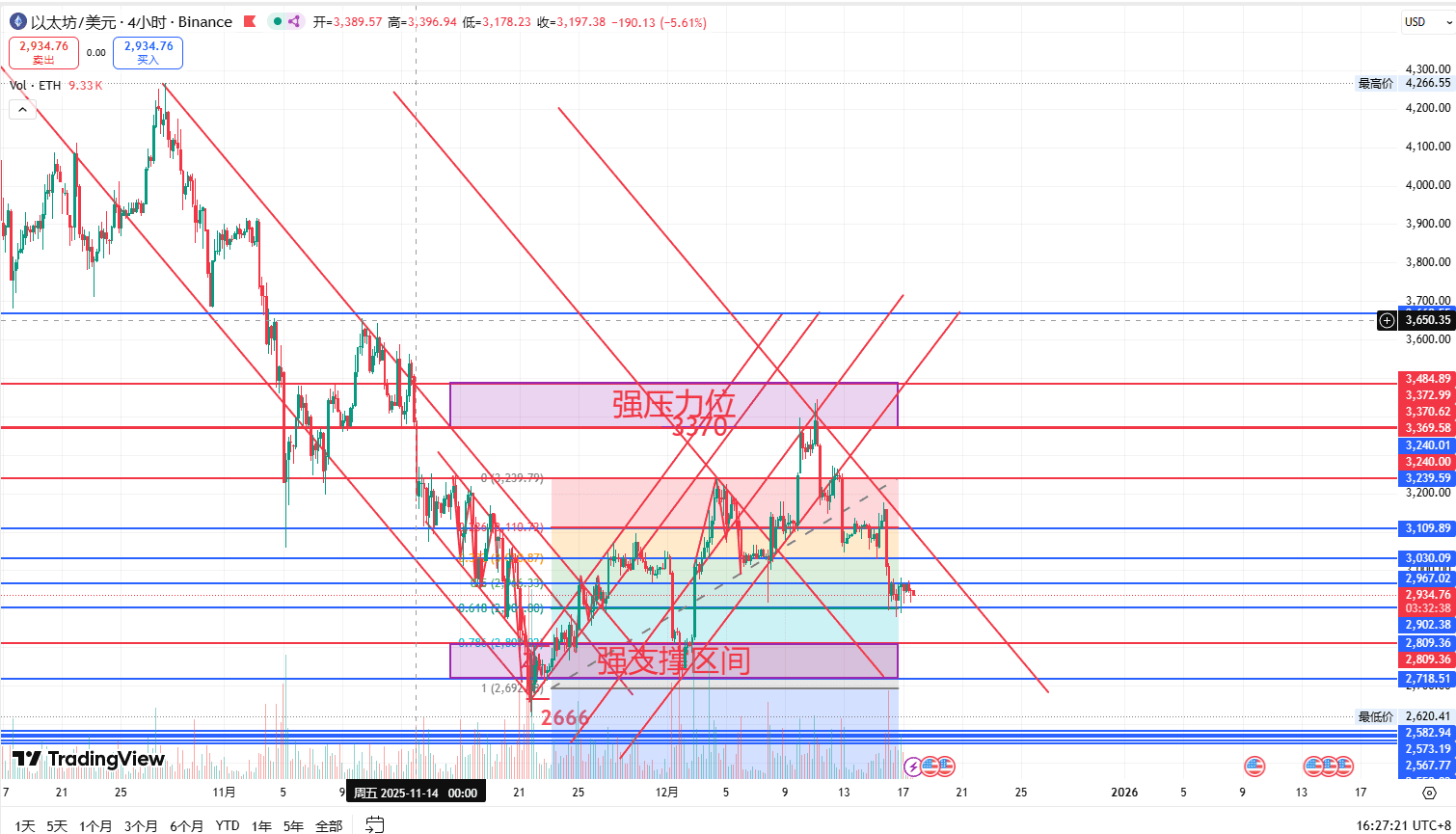$ETH Kurzfristig durch doppelte Kernfaktoren gestört, die bearishen Bedingungen haben sich nicht geändert, 2800 ist die Lebenslinie für Long und Short.