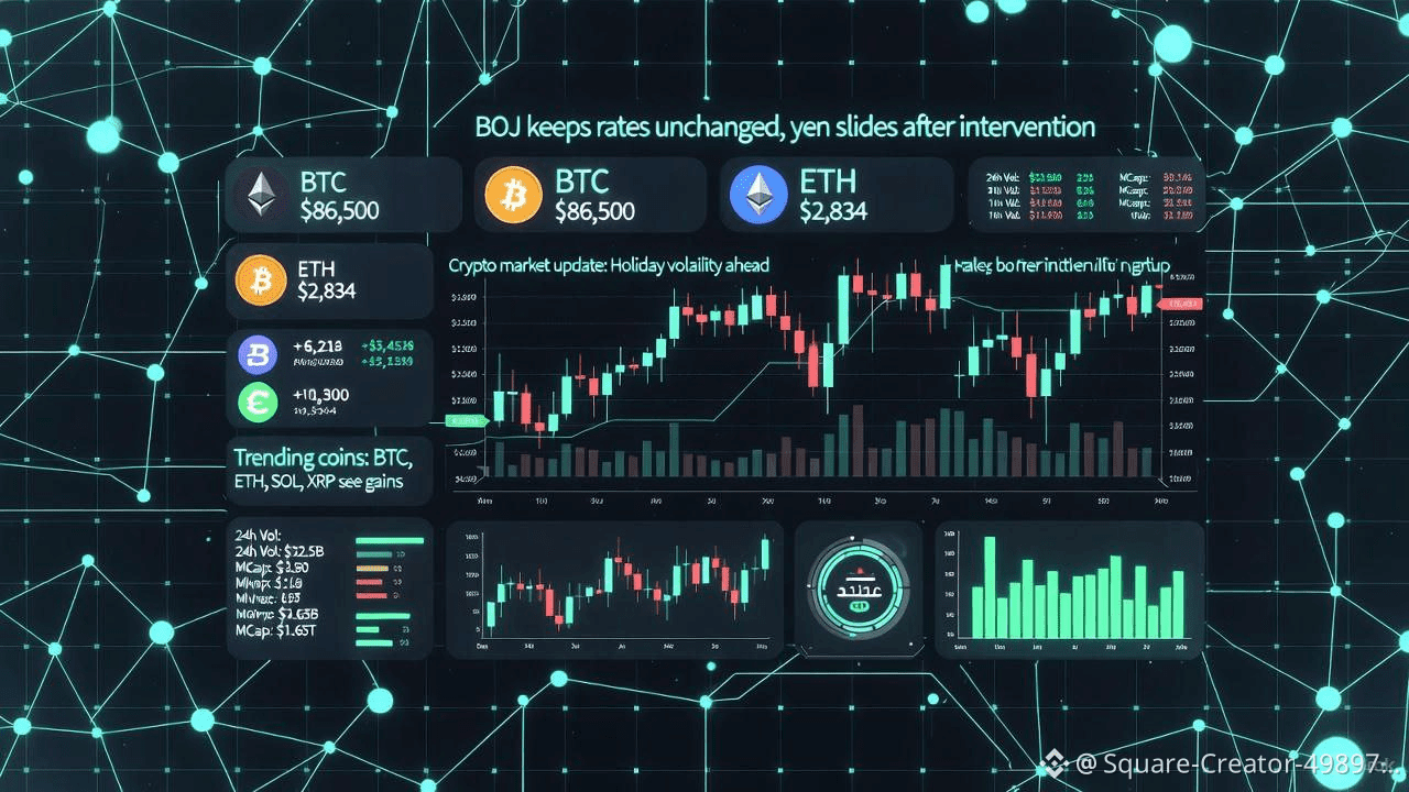 البيتكوين: حوالي ٨٦,٥٠٠ دولار (-٠.٩٣٪) - حافظ على مستوى دعم ٨٥ ألف دولار بعد ارتفاع وانخفاض قصيرين عند ٩٠ ألف دولار؛ وقد ساهم نقص السيولة في تفاقم الوضع. يترقب المحللون قرار بنك اليابان بشأن سعر الفائدة غدًا لمعرفة مخاطر تراجع الين.