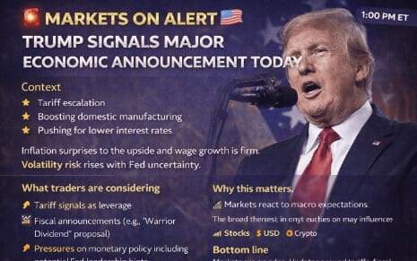 MĂRKTE IN ALARMBEREITSCHAFT: TRUMPS WIRTSCHAFTSSIGNAL FĂLLT HEUTE (1:00 PM ET)Etwas GroĂes kommt â und die HĂ€ndler beobachten genau. Der ehemalige US-PrĂ€sident Donald Trump soll heute eine wichtige wirtschaftliche AnkĂŒndigung machen, mit Botschaften, die sich auf Aktien, Anleihen, USD und Krypto-MĂ€rkte auswirken könnten. Die Einzelheiten sind begrenzt, was genau der Grund ist, warum das Risiko der VolatilitĂ€t steigt. DIE EINSTELLUNGTrumps aktuelle wirtschaftliche ErzĂ€hlung war laut, direkt und marktbewegend. Der Fokus bleibt auf: Aggressive Zollpolitik InlĂ€ndische Produktion und Arbeitsplatzwachstum Druck auf die Geldpolitik in Richtung niedrigerer ZinssĂ€tze Gleichzeitig zeigen makroökonomische Daten: Inflation kommt stĂ€rker als erwartet Lohnwachstum bleibt stabil Wachsendes Spekulieren ĂŒber zukĂŒnftige Zinssenkungen der Federal Reserve Diese Kombination schafft ein Ă€uĂerst sensibles Umfeld fĂŒr Risikoanlagen. WICHTIGE THEMEN ZUM BEOBACHTEN âą Zölle als Hebel Zölle bleiben ein zentrales Werkzeug in Trumps Strategie, positioniert als Einnahmequelle und Katalysator fĂŒr das inlĂ€ndische Wachstum. âą Fiskalische Signalisierung Die vorgeschlagene $1,776 âKrieger-Dividendeâ fĂŒr MilitĂ€rangehörige, die angeblich an die Zoll Einnahmen gebunden ist, fĂŒgt eine populistische fiskalische Perspektive hinzu, die die MĂ€rkte sorgfĂ€ltig interpretieren werden. âą Geldpolitischer Druck Trump hat offen niedrigere ZinssĂ€tze befĂŒrwortet und wird voraussichtlich Absichten signalisieren, einen neuen Fed-Vorsitzenden zu ernennen, der mit dieser Sichtweise ĂŒbereinstimmt. WARUM DIE MĂRKTE INTERESSIERT SIND Das ist nicht nur Politik â es ist eine vorausschauende Orientierung. Jeder Hinweis auf: Höhere Zölle â Inflationsrisiko Niedrigere ZinssĂ€tze â LiquiditĂ€tsoptimismus Ănderungen in der Fed-FĂŒhrung â politische Unsicherheit kann die USD-StĂ€rke, Anleiherenditen und die Risikobereitschaft innerhalb von Minuten verschieben. Krypto-HĂ€ndler sollten besonders beobachten: BTC-Reaktion auf USD und Renditebewegungen Altcoin-VolatilitĂ€t, wenn sich die LiquiditĂ€tserwartungen Ă€ndern UNTERSTE LINIE MĂ€rkte hassen Unsicherheit â aber sie bewegen sich am schnellsten, bevor Klarheit eintritt. Diese AnkĂŒndigung könnte: Risikobereitschaft verstĂ€rken Kurzfristige VolatilitĂ€t auslösen Den Ton fĂŒr die politischen Erwartungen in den nĂ€chsten makroökonomischen Zyklus setzen #BREAKING $TRUMP TRUMP5.112-1.14%