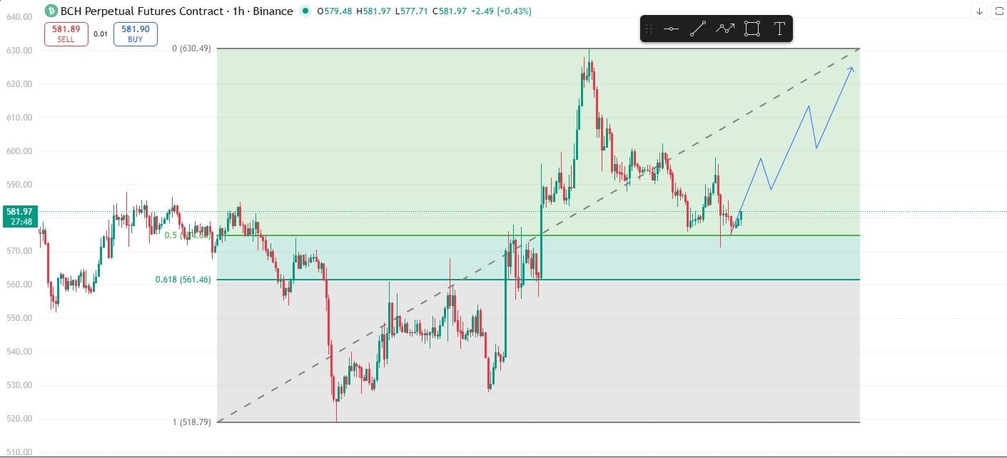 BCH hält nun eine starke Nachfragezone um 570–575 $, die mit dem vorherigen Unterstützungsbereich übereinstimmt.