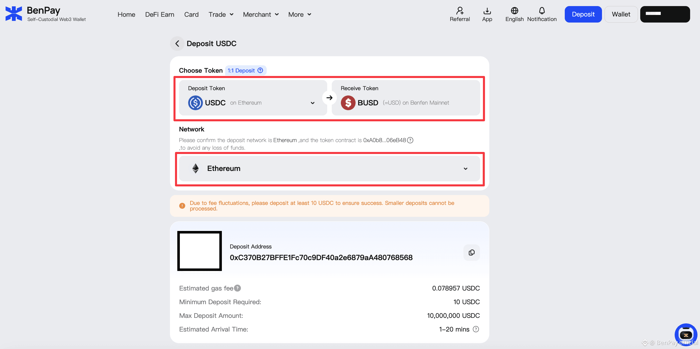 Once connected, prepare your capital. You can directly deposit USDC or USDT into your BenPay wallet from multiple supported networks including ETH, BSC, Polygon, and Solana. These are seamlessly converted at a 1:1 fixed ratio into BUSD — a dollar-pegged stablecoin issued by BenFen—ready to generate stablecoin yield. The minimum investment starts from 100 BUSD.