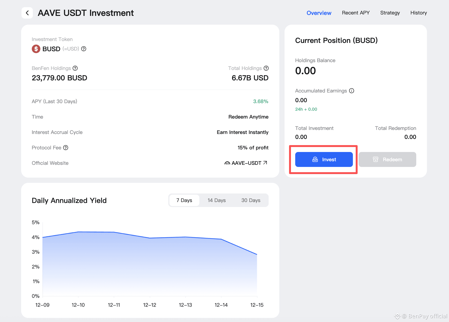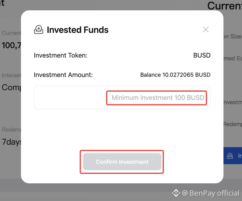 A confirmation window will pop up. Enter the amount of BUSD you wish to invest, click “Confirm,” and authorize the transaction with your wallet password. Once confirmed, your assets immediately begin working. You can then monitor your accumulated DeFi earnings in real-time within your BenPay dashboard.