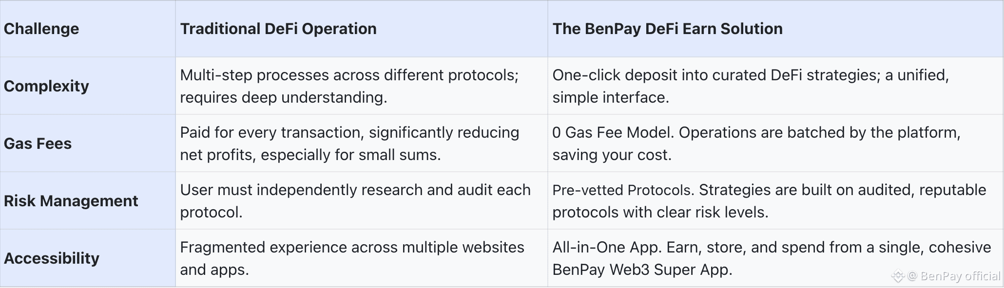 ChallengeTraditional DeFi OperationThe BenPay DeFi Earn SolutionComplexityMulti-step processes across different protocols; requires deep understanding.One-click deposit into curated DeFi strategies; a unified, simple interface.Gas FeesPaid for every transaction, significantly reducing net profits, especially for small sums.0 Gas Fee Model. Operations are batched by the platform, saving your cost.Risk ManagementUser must independently research and audit each protocol.Pre-vetted Protocols. Strategies are built on audited, reputable protocols with clear risk levels.AccessibilityFragmented experience across multiple websites and apps.All-in-One App. Earn, store, and spend from a single, cohesive BenPay Web3 Super App.