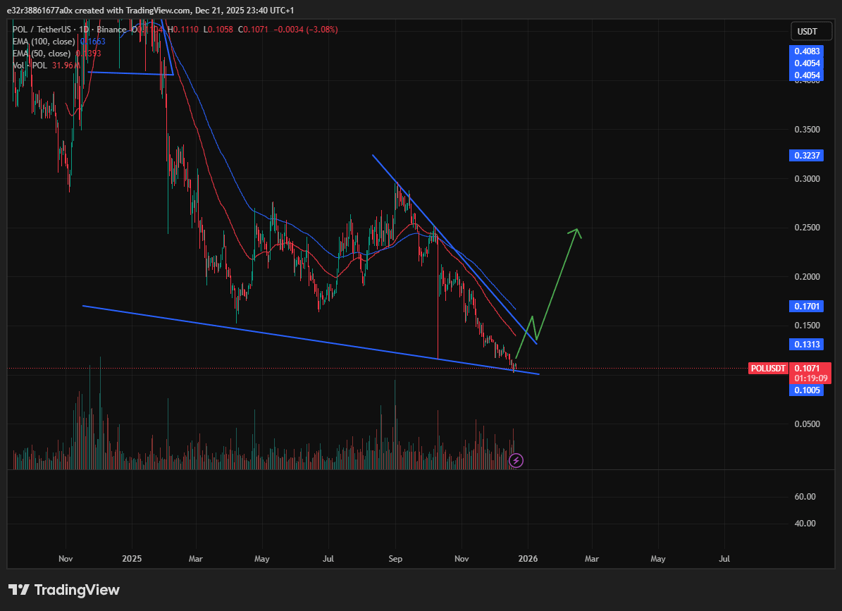Laut den Charts könnte bald eine Erholung stattfinden, da Polygon jetzt den Boden eines mehrjährigen fallenden Keils um $0,1 erreicht hat.