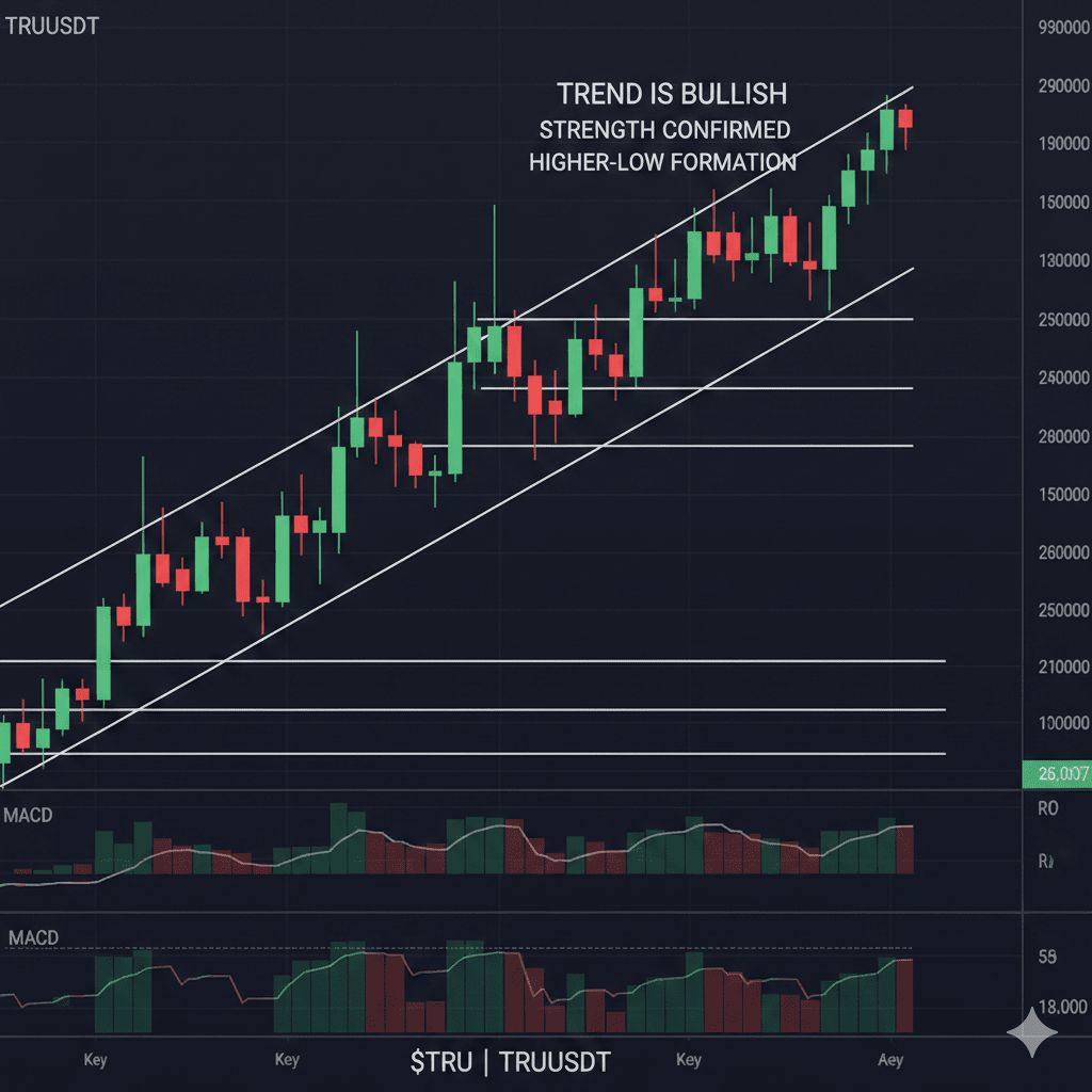 $TRU TRU zeigt weiterhin eine klassisch bullische Marktstruktur, und die Preisbewegung bleibt äußerst konstruktiv. Der Chart zeigt eine klare Abfolge starker impulsiver Bewegungen, gefolgt von gesunden, kontrollierten Rückzügen – genau das, worauf nachhaltige Aufwärtstrends basieren.