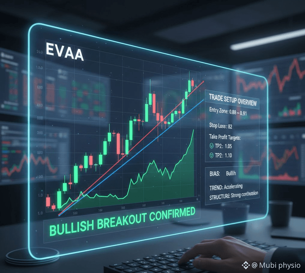 Momentum favors the bulls as long as EVAA maintains price acceptance above the 0.88–0.91 support zone. A sustained hold above this range keeps the breakout intact and opens the path toward higher targets. Failure to hold support would invalidate the setup and trigger the stop.