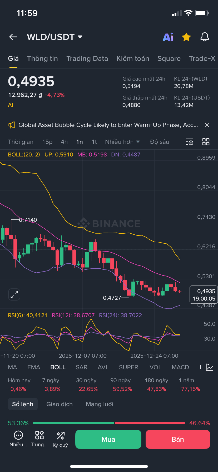 Aktueller Preis: ~ $0.49–$0.67 je nach Analysequelle, was zeigt, dass WLD im Vergleich zu seinem historischen ATH in einem niedrigen Preisbereich ist.