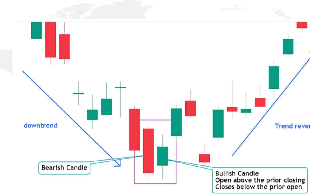 Die erste Kerze zeigt starken Verkaufsdruck, während die zweite Zögern und die Möglichkeit einer Umkehr signalisiert. Der kleinere Körper innerhalb des vorherigen Bereichs spiegelt eine reduzierte Volatilität wider.