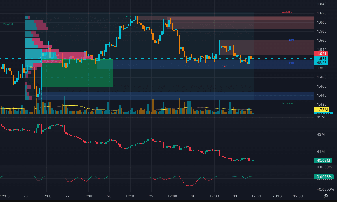 Der Preis hat sich seitdem in den mittleren Bereich um 1.52 zurückgedreht, ohne neue bullische CHOCH zu bilden.