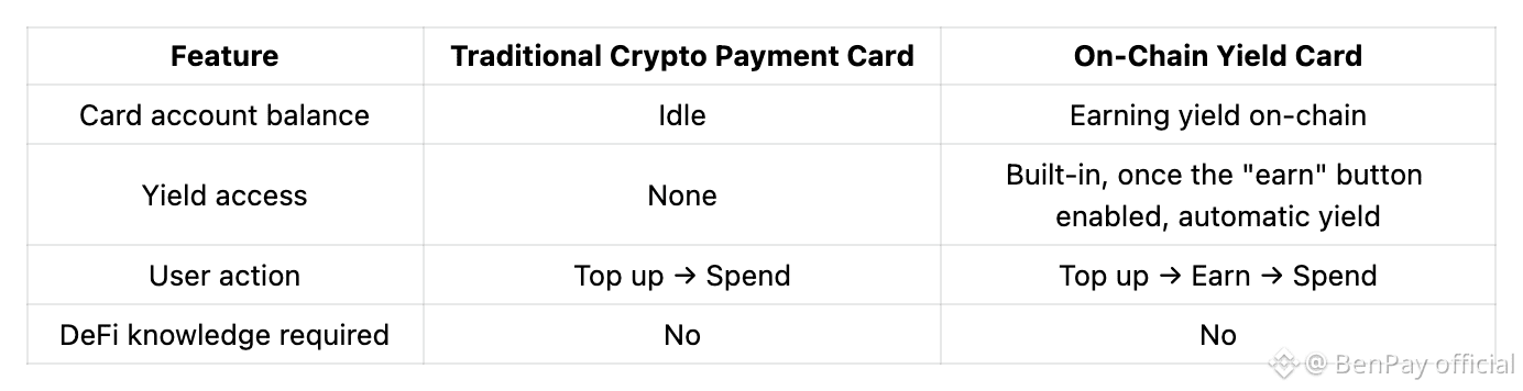 To illustrate how an on-chain yield card works in practice, consider the BenPay On-Chain Yield Card (mentioned purely as an example).