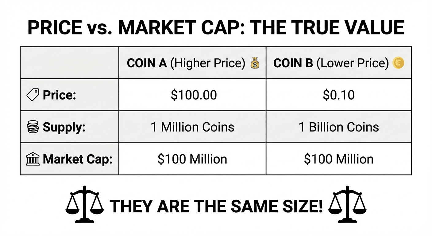 Um die wahre "Größe" und den Wert eines Projekts zu sehen, musst du die Marktkapitalisierung betrachten, nicht nur das Preisschild. Hier ist die einfache Mathematik: