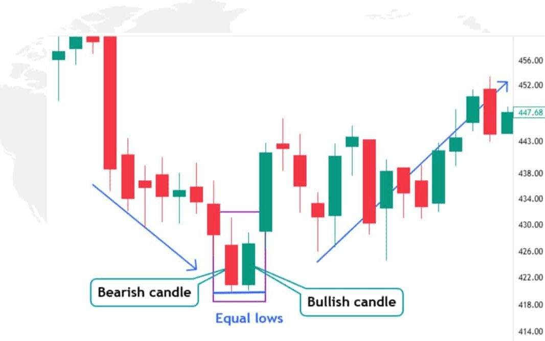 👉Die erste Kerze ist normalerweise bärisch, gefolgt von einer bullischen Kerze, die höher schließt. Die übereinstimmenden Tiefs zeigen, dass die Verkäufer gescheitert sind, die Preise weiter nach unten zu drücken.
