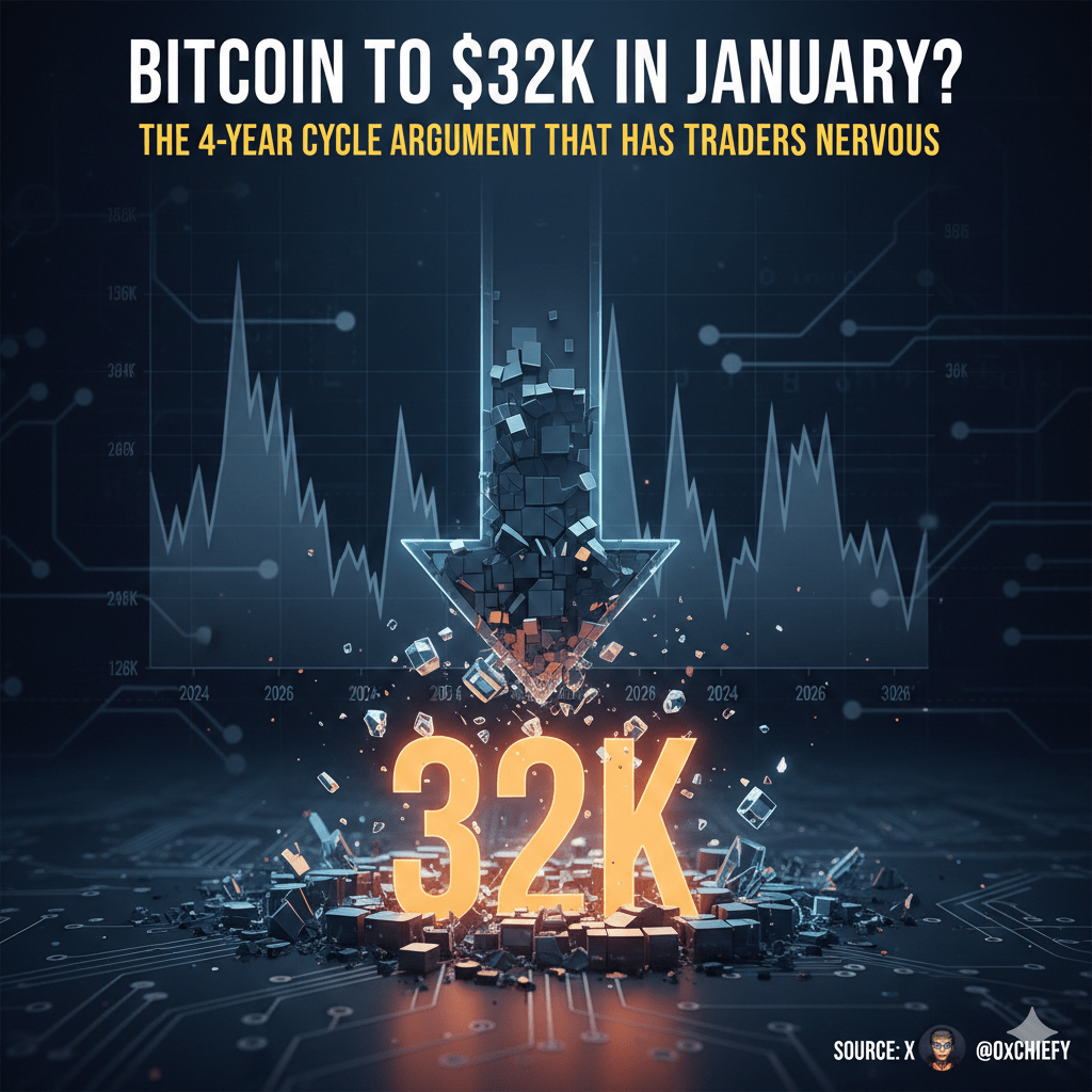 In diesem Kontext der Marktmüdigkeit hat eine technische Analyse des Traders Chiefy an Bedeutung gewonnen. Seine These legt nahe, dass, wenn die historischen 4-Jahres-Zyklusstrukturen gültig bleiben, Bitcoin bis Januar 2026 mit einer signifikanten Korrektur in Richtung der $32.000-Marke konfrontiert sein könnte.