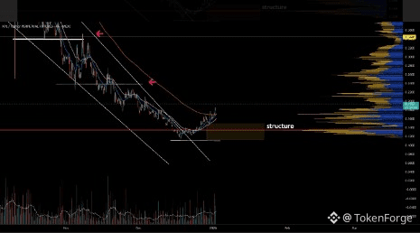 Price has successfully broken out of a descending channel, marking a notable shift in market behavior. This breakout represents a change from lower highs and lower lows into a more constructive structure, suggesting that selling pressure is no longer dominant.