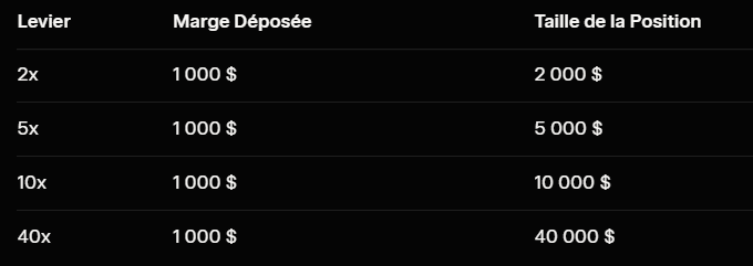 Hier ist ein Beispiel einer Tabelle, die den Einfluss des Hebels auf eine Marge von 1.000 US-Dollar veranschaulicht: