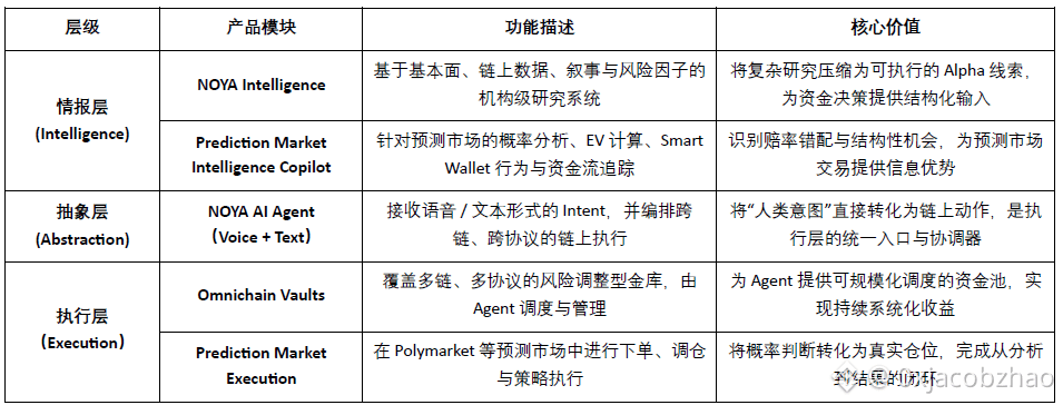 在产品形态上,NOYA 支持被动收益型用户、主动交易者以及预测市场参与者等不同参与方式,并通过 Omnichain Execution、AI Agents & Intents、Vault Abstraction 等设计,将多链流动性管理、复杂策略执行与风险控制模块化、自动化。