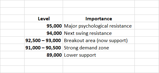 Die Upside-Ziele sind: 93,5k – 94,2k (frühere Swing-Hochs) 95.000 (wichtigem psychologischen Widerstand)