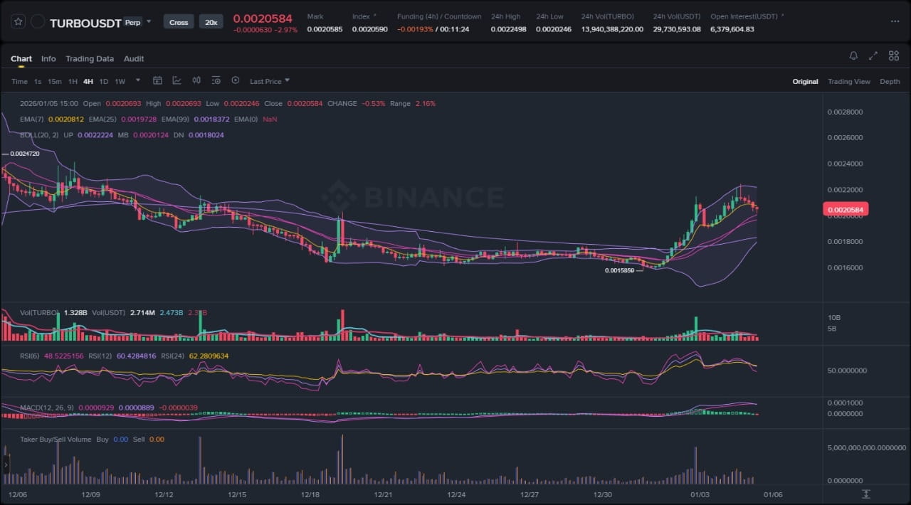 Das Binance-Diagramm für TURBO zeigt einen klaren Ausbruch aus einem mehrwöchigen Abwärtstrendkanal und wechselt in eine impulsive bullische Struktur. Kerzenmuster zeigen einen scharfen vertikalen Anstieg in den letzten 24 Stunden, der durch frühere Widerstandsniveaus mit erweiterter Volatilität durchdringt. Wichtige beobachtbare Elemente sind der 50-Perioden gleitende Durchschnitt, der entscheidend über dem 200-Perioden MA kreuzt—was das goldene Kreuz bestätigt—neben einem Volumenspitzen, die die letzten Durchschnittswerte in den Schatten stellt und starkes Überzeugungskaufen anzeigt. Lokale Schwunghochs aus der Mitte von November sind jetzt Unterstützung, während die Ablehnung der unteren Bollinger-Bänder einen Momentumwechsel unterstreicht. Insgesamt bleibt die Tendenz bullisch, da die Preisbewegung höhere Tiefs innerhalb des Aufwärtstrends respektiert, ohne dass sofortige Verteilungssignale erkennbar sind.