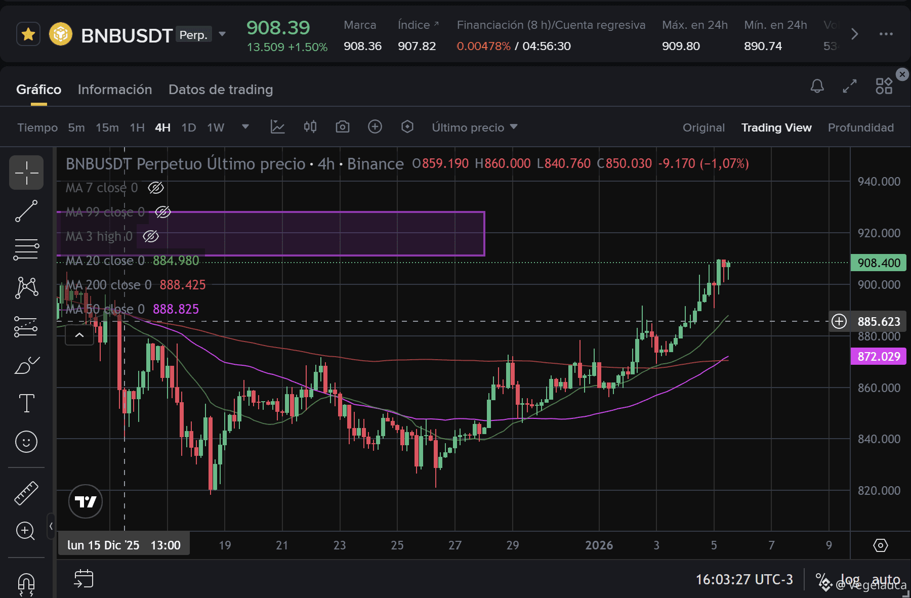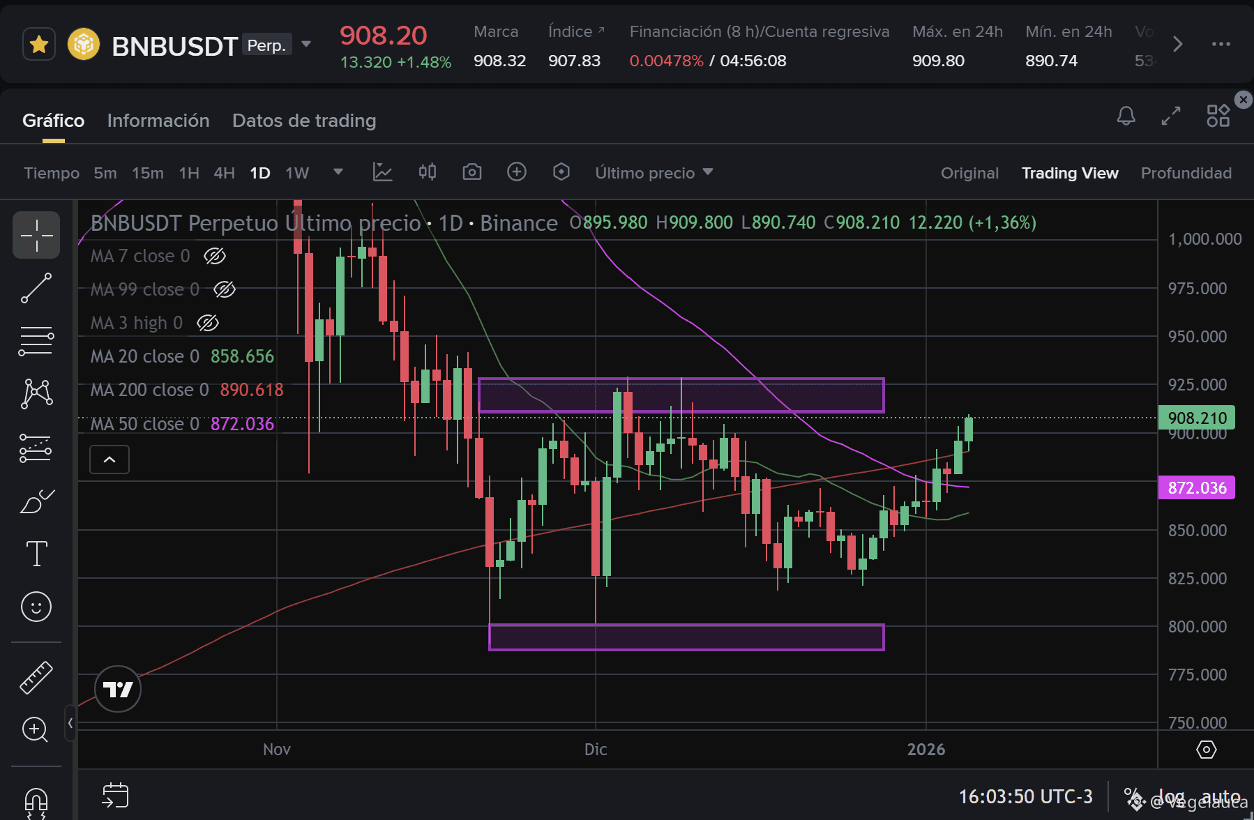 Al superar esta media móvil de largo plazo, BNB entra técnicamente en territorio alcista macro. Además, la MA 20 (Línea verde) en $858.65 comienza a curvarse al alza, confirmando el impulso.