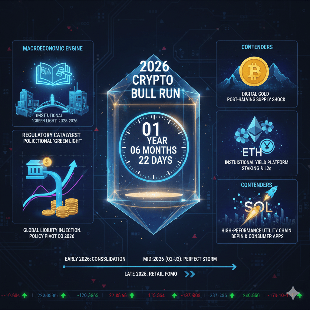 Da der Kryptomarkt die letzte Phase seines aktuellen Zyklus durchläuft, blicken Analysten und Anleger bereits in die Zukunft und stellen die entscheidende Frage: Wann wird der nächste große Bullenmarkt 2026 beginnen? Obwohl die genaue Zeit noch spekulativ ist, deuten eine Vielzahl makroökonomischer, regulatorischer und technologischer Faktoren auf eine mögliche Entzündungsphase im zweiten Halbjahr 2026 hin, wobei Schlüsselaktiva wie Bitcoin (BTC), Ethereum (ETH) und Solana (SOL) in Führung gehen könnten.