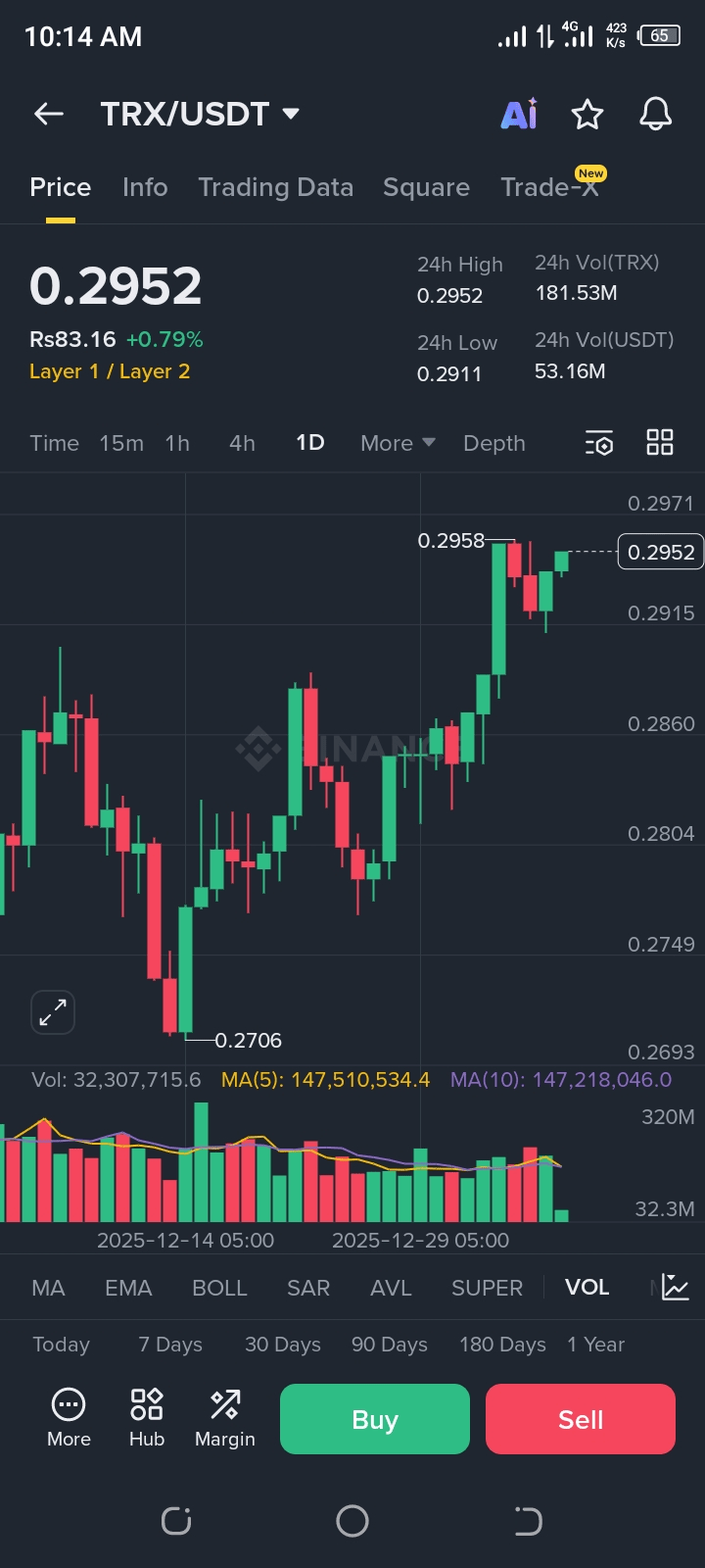 Das sieht nach einem langsamen Grinder aus, bevor sich die Dynamik entfaltet. Wenn der Markt unterstützend bleibt, $TRX hat Platz, um späte Verkäufer zu überraschen.