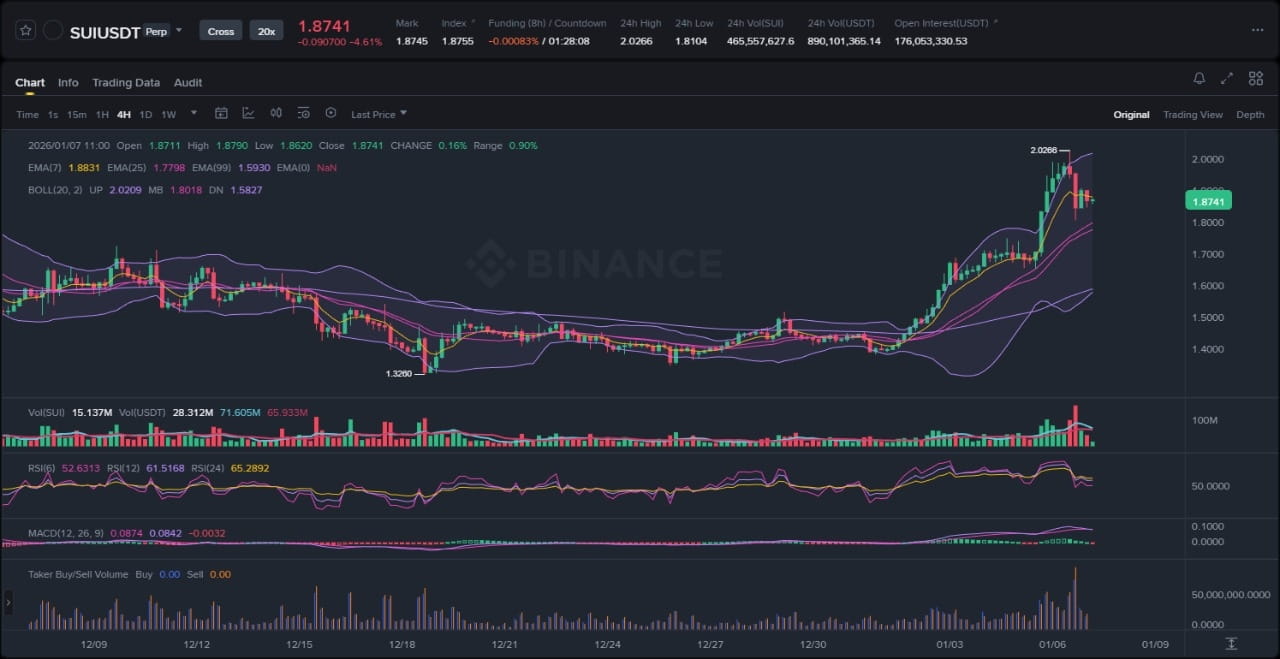 Das SUI/USDT-Paar auf Binance zeigt in den letzten sieben Tagen eine klare Aufwärtstrendstruktur, gekennzeichnet durch eine Reihe höherer Hochs und höherer Tiefs, nachdem eine Konsolidierungsphase zu Beginn des Monats stattgefunden hatte. Derzeit handelt es sich um etwa 2,00 USD, wobei der Kurs aus einem mehrtägigen Bereich zwischen 1,70 und 1,90 USD herausgebrochen ist und versucht, oberhalb dieses Ausbruchsniveaus zu bestehen. Sichtbare Elemente umfassen einen impulsiven Aufwärtsschub vom lokalen Tief bei 1,70 USD am 4. Januar, gefolgt von einer kurzen Konsolidierung nahe 1,95, bevor der letzte Rückgang an der Bereichsgrenze erfolgte, die nun als Unterstützung retestet wird. Die Volatilität hat zugenommen, was sich in den sich verbreiternden Bollinger-Bändern zeigt, wobei der Kurs die obere Bande berührt, was eine mögliche Überdehnung signalisiert, aber auch Raum für eine Mean-Reversion in Richtung der mittleren Bande bietet, falls der Impuls nachlässt.