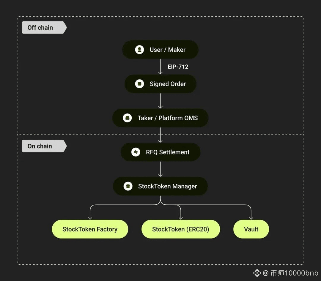 围绕该目标,Stove 系统并未简单采用“链下托管 + 链上发币”的直连模式,而是将股票代币化拆解为若干相互解耦、但可验证衔接的关键环节:交易意图与现实市场执行发生在链下,资产映射、结算与状态记录发生在链上。协议本身不充当交易对手,也不参与流量竞争,而是专注于将现实证券市场的执行结果,以可验证的方式引入链上体系。