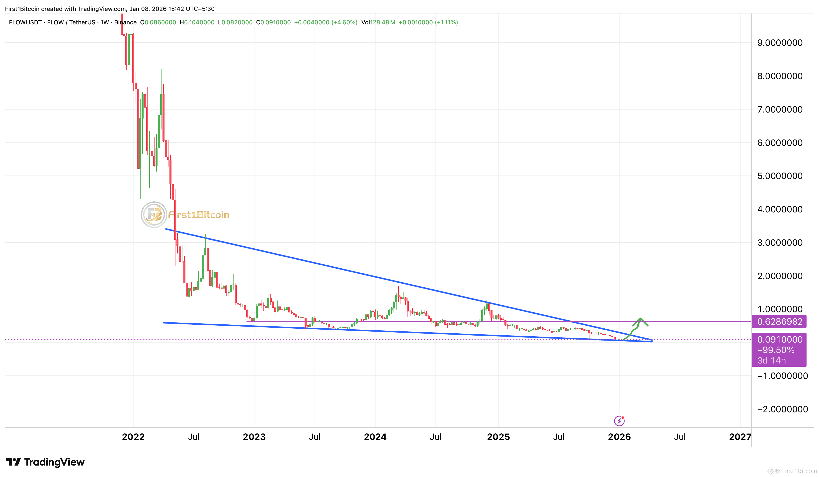 $FLOW has spent years in a clean descending structure, now trading near cycle lows with volatility fully compressed.