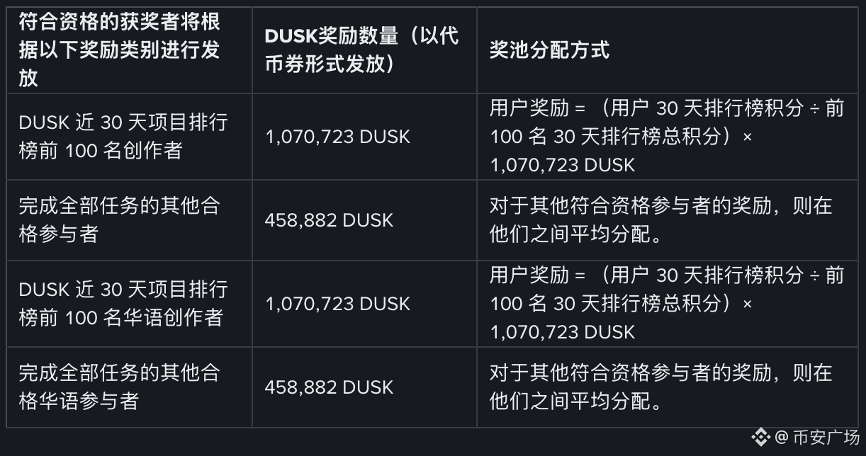 符合资格的用户将以活动结束当日为准,按照 DUSK 近 30 天排行榜的最终结果进行排名。