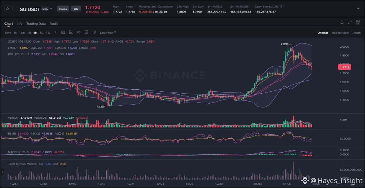 The chart for SUI/USDT on the 4-hour timeframe illustrates a clear uptrend structure, characterized by higher highs and higher lows since the December 2025 bottom around 1.20 USDT. Price has broken out from a multi-week consolidation range between 1.50 and 1.80 USDT, forming an impulsive move upward that pierced through the 2.00 psychological barrier with conviction. Observable elements include a sharp rejection at the recent swing high near 2.10 USDT, followed by a brief pullback that found support at the 1.95 level, and now a volatility expansion as bands widen, indicating increasing participation. Using exponential moving averages (EMAs), the 7-period EMA (currently at 2.01) slopes bullishly above the 25-period EMA (1.92), while both remain well above the 99-period EMA (1.75), confirming the uptrend without signs of mean reversion yet. Bollinger Bands further support this, with price hugging the upper band after a squeeze resolution, suggesting sustained momentum rather than overbought exhaustion.