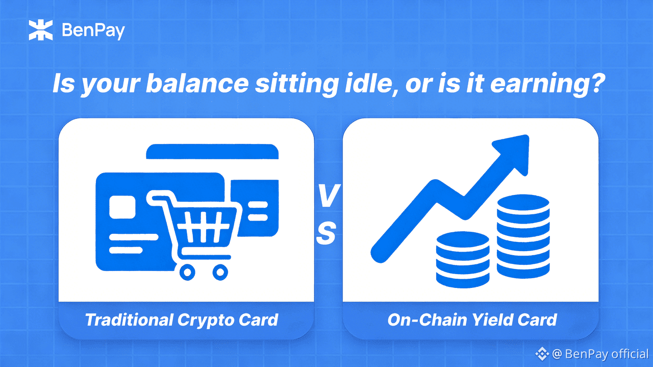 A traditional crypto payment card is essentially a "channel." Its design philosophy focuses on being an efficient conversion tool, with its core value lying in "connectivity." Under this model, the funds are merely held idle in the card and do not generate any yield. This is akin to keeping cash in a non-interest-bearing drawer—it simply sits there, waiting to be spent, without growing on its own.