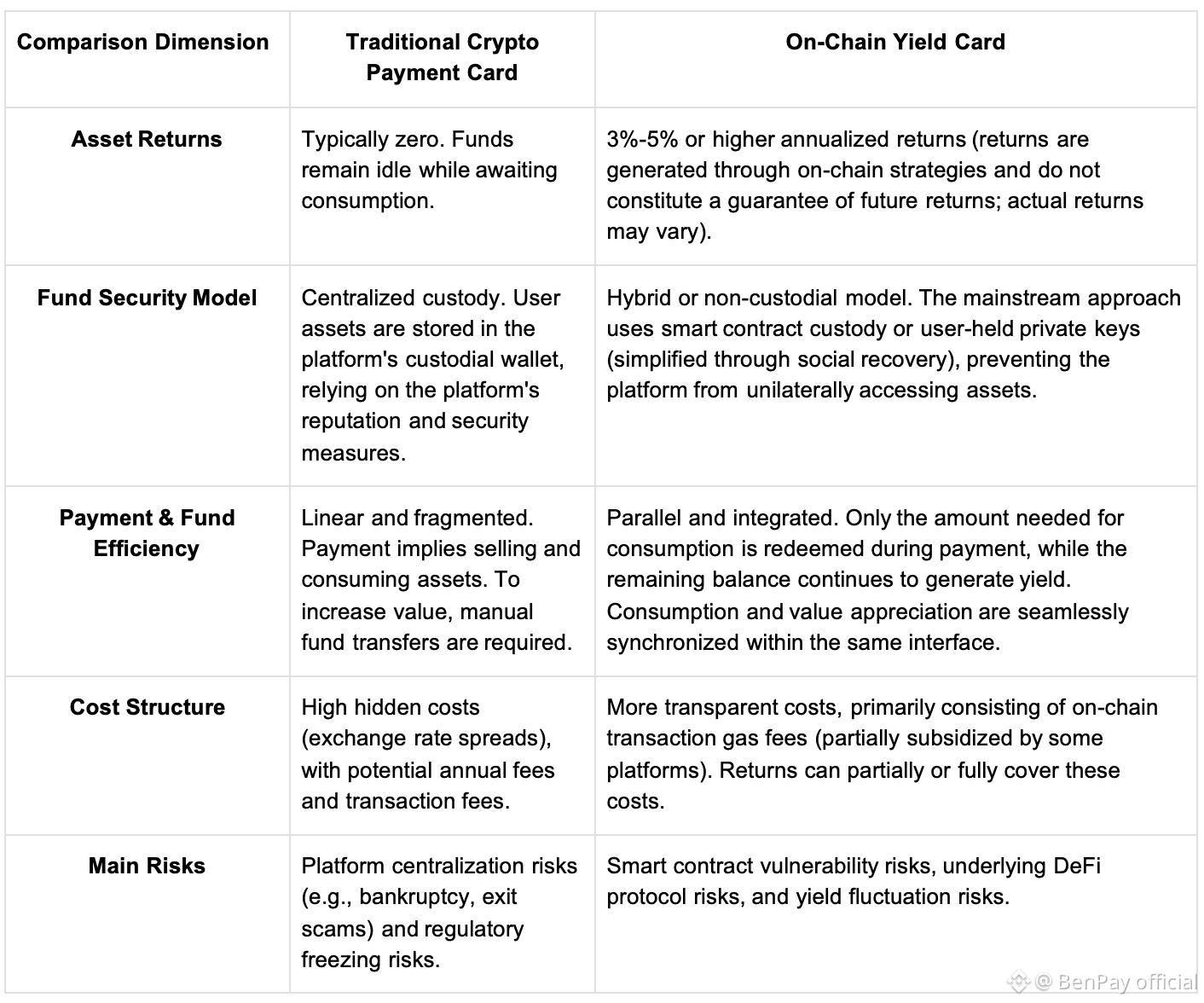 This article will systematically compare: the core differences between on-chain yield cards and traditional crypto payment cards; how they differ in terms of yield, security models, and payment experience; whether on-chain yield cards are the same as DeFi and whether they are truly more secure; and, with reference to the real-world product practice of BenPay, help you decide which is more suitable for long-term use.