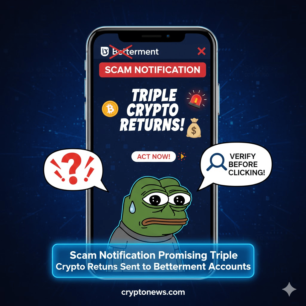 Benutzer der Betterment-Investitionsplattform wurden mit einer betrügerischen Betrugsmeldung Ziel, die dreifache Kryptorenditen versprach und dazu aufforderte, schnell zu handeln. Die Warnung war gefälscht und wurde nicht von Betterment selbst herausgegeben, erreichte jedoch tatsächlich Kundenkonten und löste Bedenken hinsichtlich betrügerischer Kommunikationsstrategien aus.