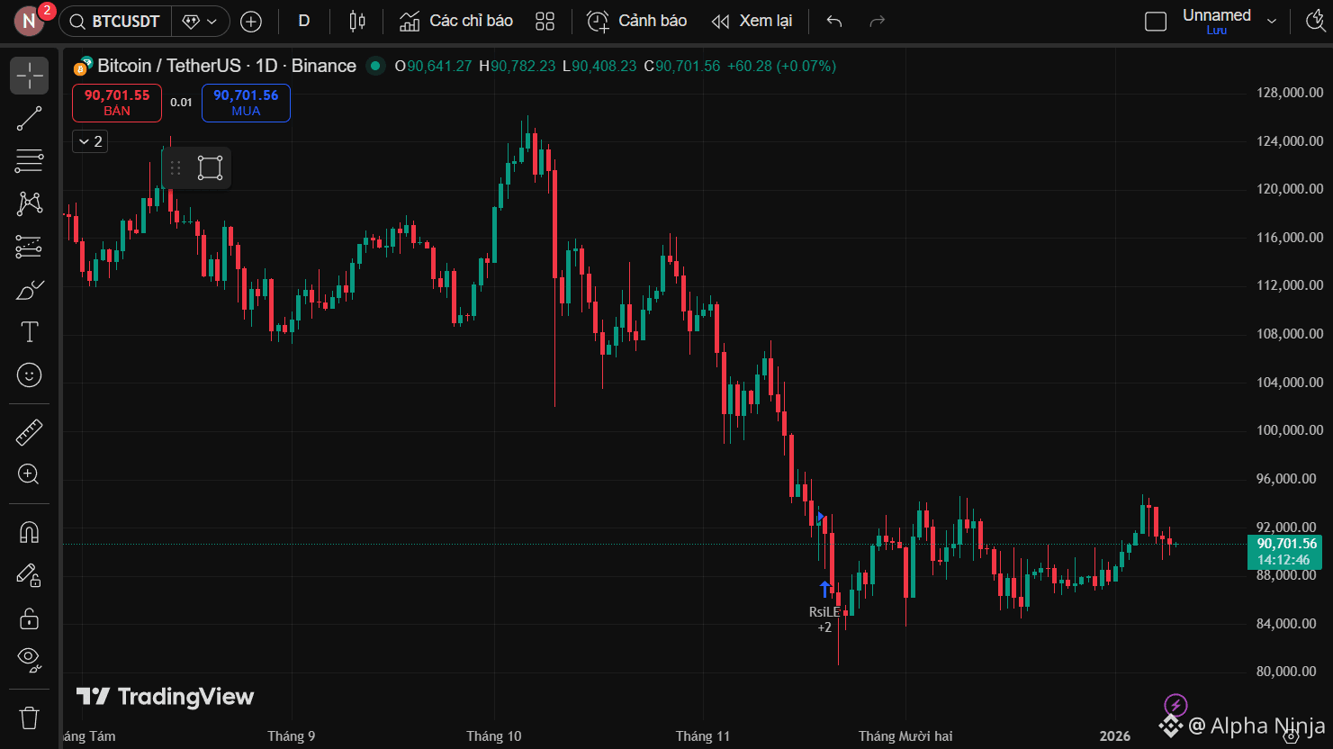 BTC khung D nhìn qua rất chán. Không pump mạnh, không dump hoảng loạn, giá bị nén trong biên hẹp khá lâu. Nhưng với người đã trải qua nhiều chu kỳ, đây là trạng thái rất quen. Sau pha giảm mạnh, thị trường cần thời gian để hấp thụ lại lượng hàng bị xả bằng cảm xúc. Điều đáng chú ý là giá không còn tạo đáy mới liên tục, mỗi nhịp đạp xuống đều được kéo lên khá nhanh.