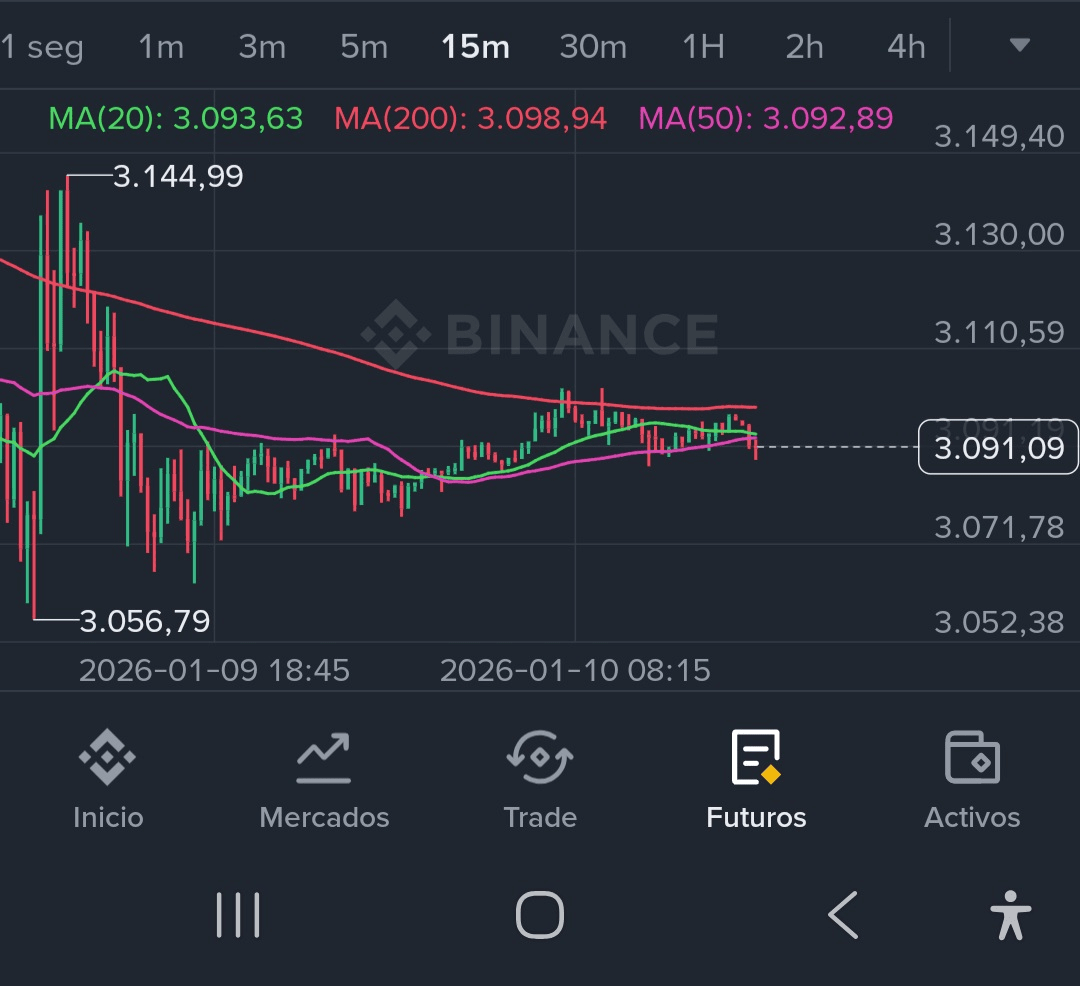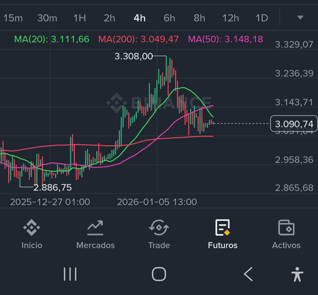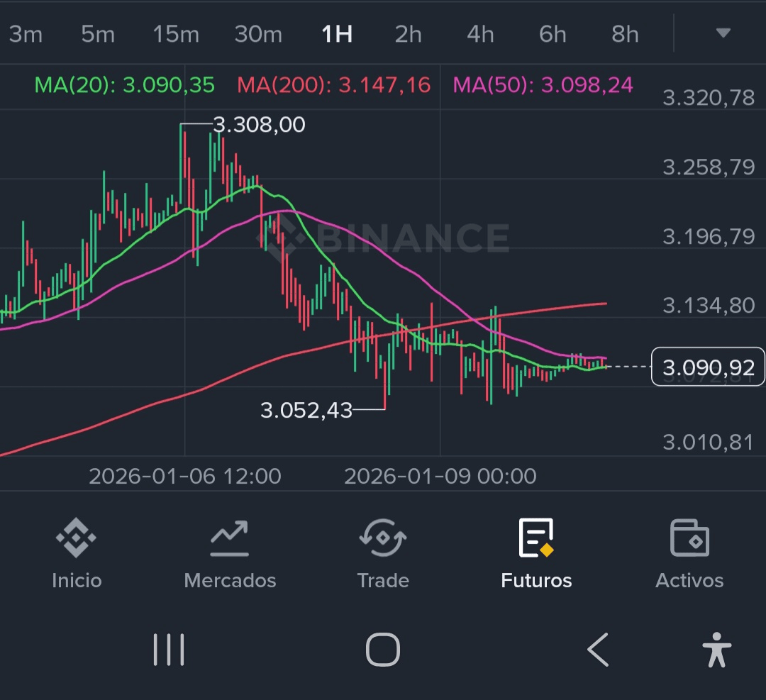 Wir schließen eine Woche ab, die uns daran erinnerte, dass der Markt nicht in gerader Linie steigt. Nach einem Anfang, der versprach, die Zone von 3.300 USDT zu erreichen, verlor der Markt an Kraft und gab einen großen Teil des Fortschritts wieder ab, stabilisierte sich erneut nahe bei 3.090 USDT. Das allgemeine Gefühl hat sich von leichter Euphorie in Vorsicht gewandelt; das Volumen ist in den letzten Stunden zurückgegangen, wodurch der Preis in einem Zustand der "Erwartung" verharrt, während der Markt die jüngste Volatilität verarbeitet.