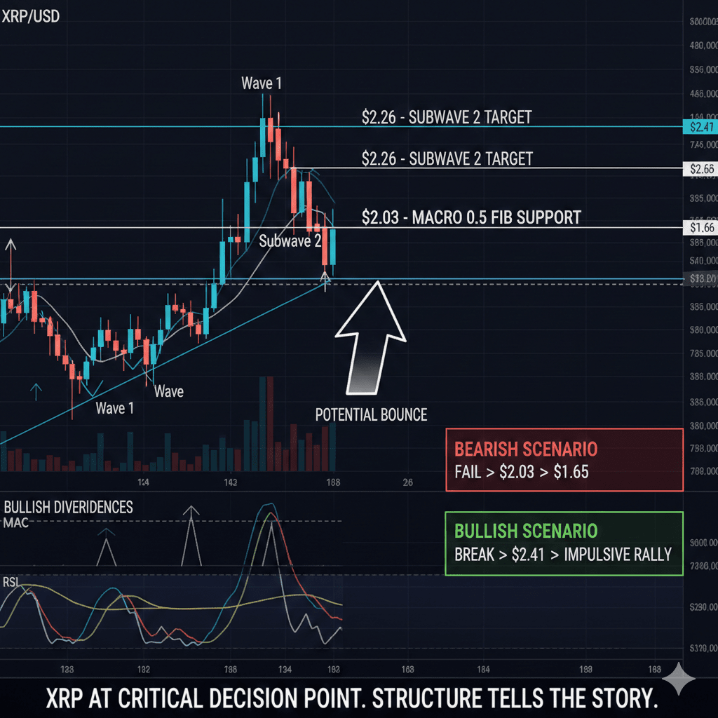 Aus Sicht der Wellenstruktur scheint die aktuelle Bewegung eine Subwelle-2-Korrektur vorzubereiten, mit einem Aufwärtspotenzial nahe bei 2,26 USD. Obwohl dieser Aufschwung konstruktiv ist, handelt es sich gleichzeitig um einen entscheidenden Entscheidungspunkt für die nächste große Richtung von XRP.