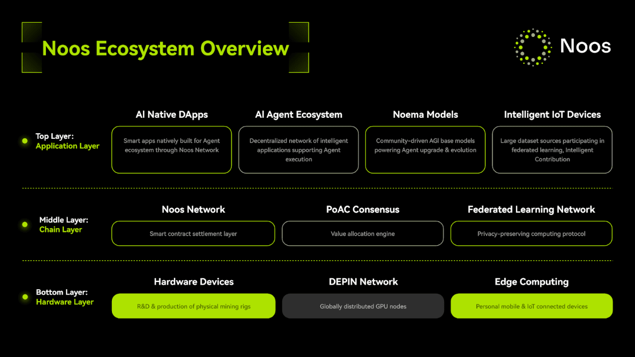 Das Noos-Netzwerk bietet Infrastruktur für Abrechnung und Koordination. PoAC fungiert als Wertverteilungsmotor, der Rechenleistung, Daten und intelligente Ausgaben präzise erfasst.