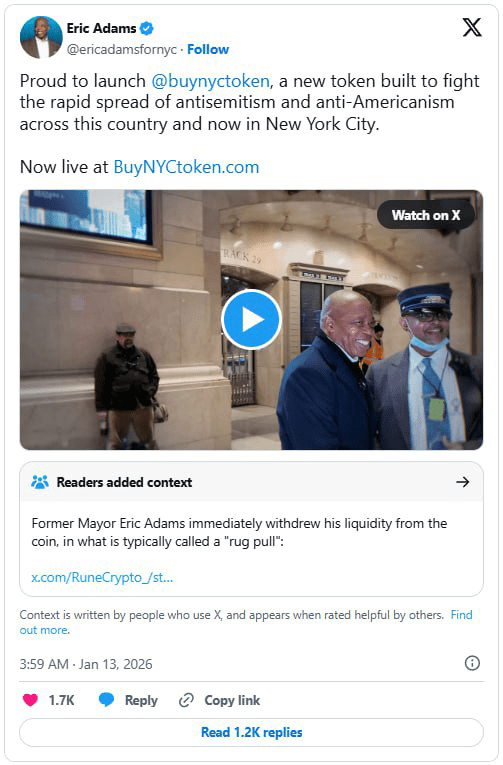 Eric Adams, ehemaliger Bürgermeister von New York und einer der pro-Krypto-orientierten Politiker der USA, ist erneut in den Fokus gerückt, nachdem er den Memecoin NYC Token auf Solana lanciert hat. Laut der offiziellen Erzählung sollte der Token dazu dienen, Antisemitismus, „Antiamerikanismus“ und die Finanzierung von Bildung im Bereich Blockchain zu bekämpfen. In der Praxis reagierte der Markt jedoch kühl bereits in den ersten Minuten.