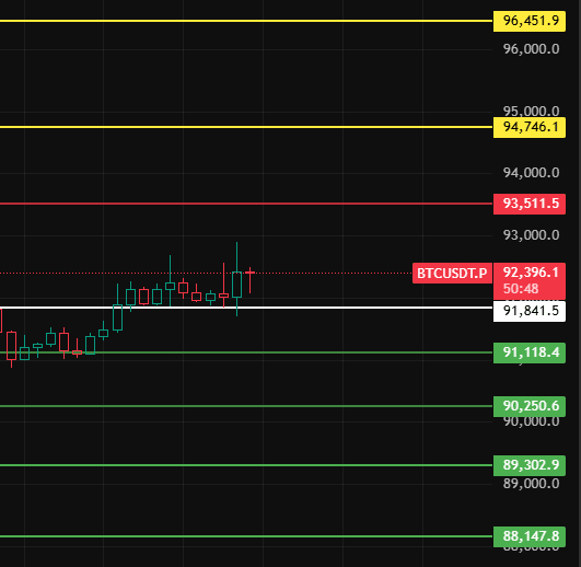 Wenn der Rückgang in der Nacht die Marke 91840 unterschreitet, beginnt die kleine Korrektur, die Unterstützungsniveaus nach unten liegen in der Nähe von 91120-90250-89300!