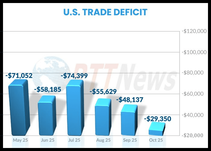 Die Vereinigten Staaten verzeichneten im Oktober 2025 ein Handelsbilanzdefizit von 29,4 Milliarden US-Dollar, den niedrigsten seit Juni 2009, und übertrafen damit die Erwartungen. Dieser Rückgang um 39 % wurde durch einen Rückgang der Importe um 3,2 % und Rekordexporte vorangetrieben, was auf eine stärker als erwartete externe Nachfrage hindeutet. Die Märkte reagierten positiv, wobei der S&P 500 das psychologisch wichtige Niveau von 7.000 erreichte und der US-Dollar-Index (DXY) sich nahe bei 98,50 stabilisierte.