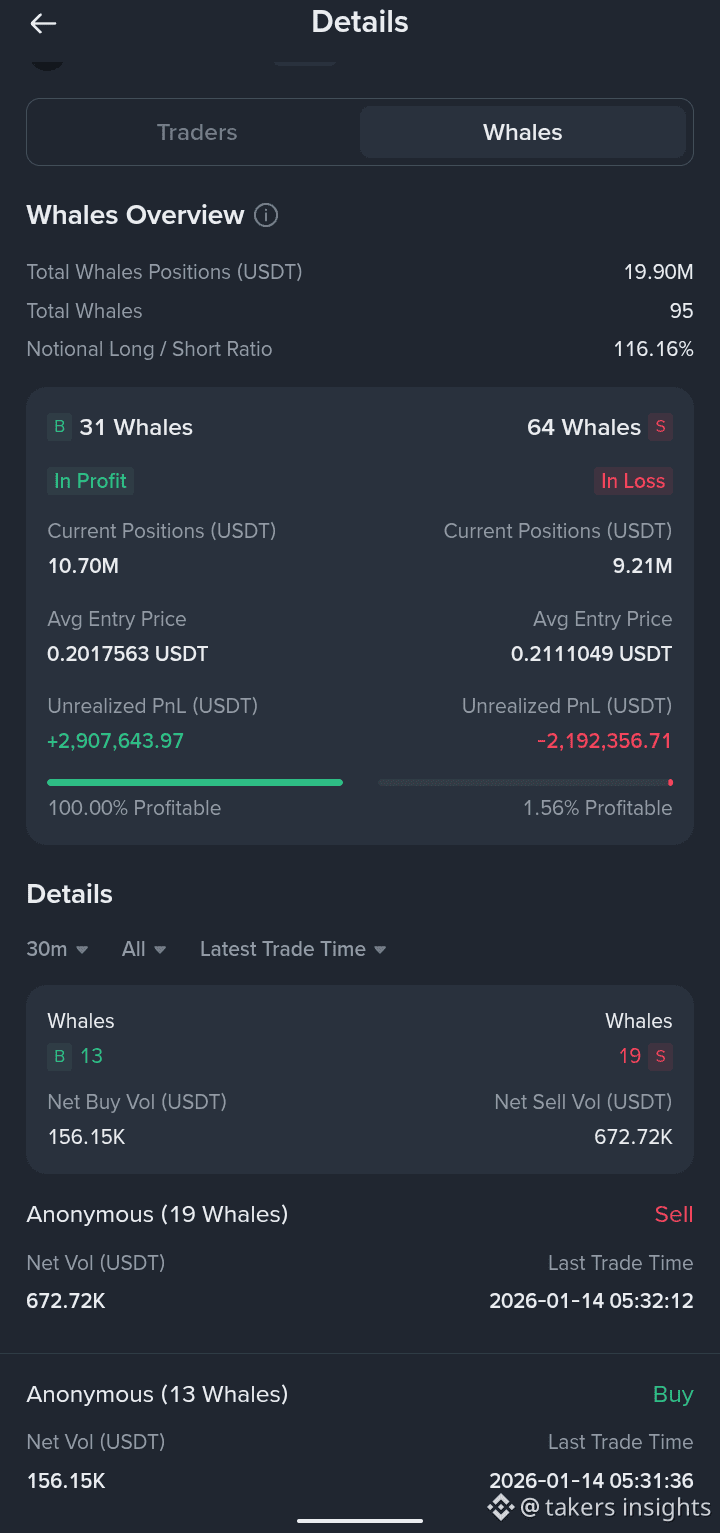 Mixed short-term flow: Recent whale activity shows more sell volume than buy volume, suggesting profit-taking or hedging, not necessarily trend reversal.
