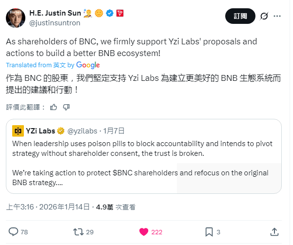 Hinter dieser Unterstützung steht die strikte Befolgung der Reinheit des BNB-Ökosystems durch YZi Labs, was bereits aus dessen Beitrag vom 7. Januar deutlich hervorgeht. Zu diesem Zeitpunkt erklärte YZi Labs öffentlich, dass der sogenannte „Pillenplan“ des BNC-Verwaltungsrats faktisch die normale Ausübung des schriftlichen Einvernehmens der Aktionäre behindert, und forderte den Verwaltungsrat auf, unangemessene Manipulationen einzustellen, um die Fairness bei der Nominierung und Wahl von Verwaltungsratsmitgliedern sicherzustellen. Noch entscheidender ist, dass YZi Labs die Aussage von BNC, niemals eine Strategie für Ersatz-Token in Betracht gezogen zu haben, direkt widerlegte. So wurde klar erwähnt, dass der CEO von BNC, David Namdar, auf einer Sitzung im November 2025 eindeutig die Absicht geäußert hatte, auf Vermögenswerte wie Solana umzusteigen – eine Korrektur von Abweichungen von der Kernstrategie des BNB-Ökosystems, die genau der Grund dafür ist, dass Sun Yucheng sich auf die Seite von YZi Labs stellt.