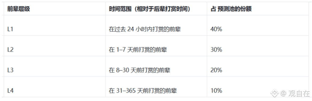 对于每个后辈的付费打赏,预测池数额会根据时间窗口分成四层,每层占比不同,如下: