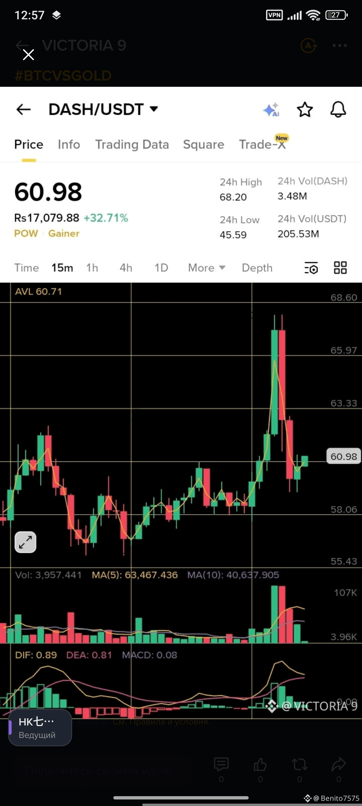 $DASH USDT торгуется по цене 60,98 с максимальным значением за 24 часа 68,20 и минимальным 45,59 Объем достиг 3,48M DASH и 205,53M USDT Технические индикаторы показывают положительный MACD Следите за глубиной рынка и скользящими средними для сигналов тренда