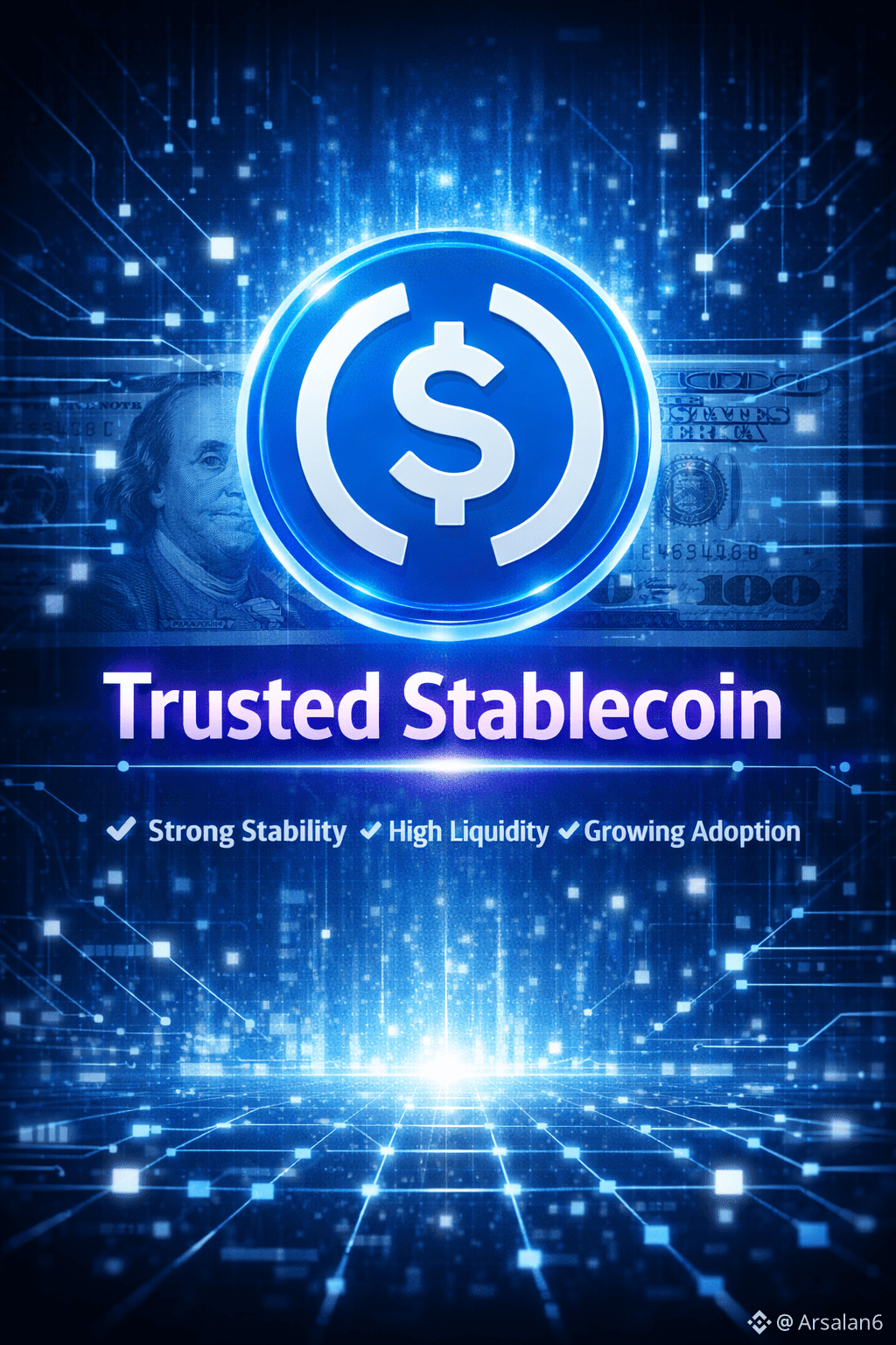 A clean crypto graphic showing a glowing USDC logo over a digital dollar background, blockchain lines, blue & white theme, “Trusted Stablecoin” text, modern finance style.