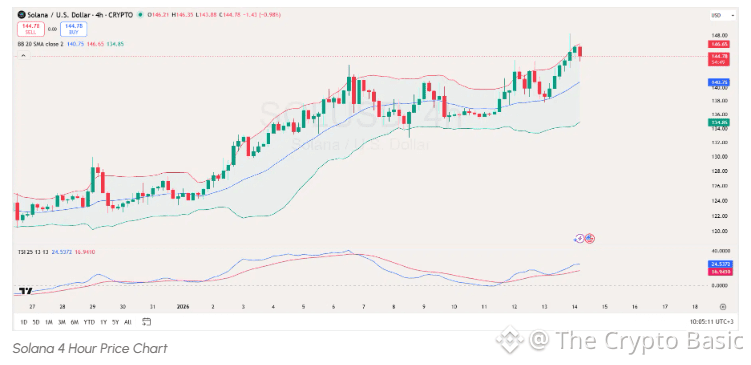 The 4-hour TradingView chart indicates that Solana recently faced rejection at the upper Bollinger Band near $146.5, which suggests that the current bullish momentum may be losing steam unless a breakout occurs. Moreover, the Bollinger Bands indicate that the market is experiencing increased volatility, and the rejection at the upper band signals potential resistance.