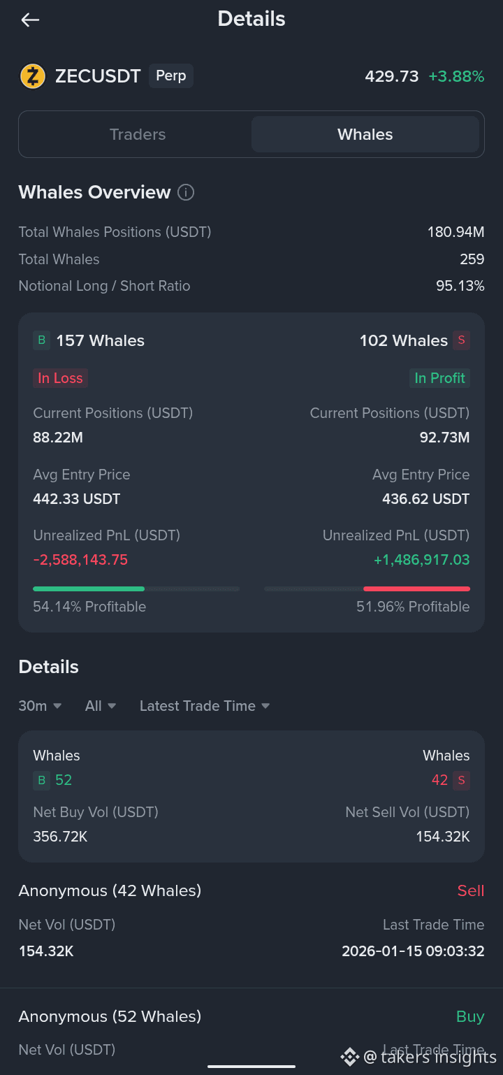 Meanwhile, whale shorts entered higher, around 436, and they’re already +1.4M USDT in profit. They’re not under pressure. Yet.