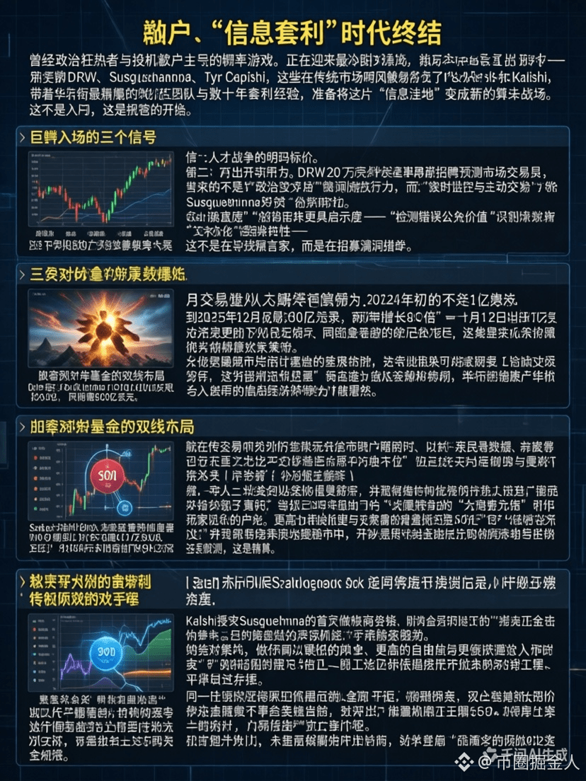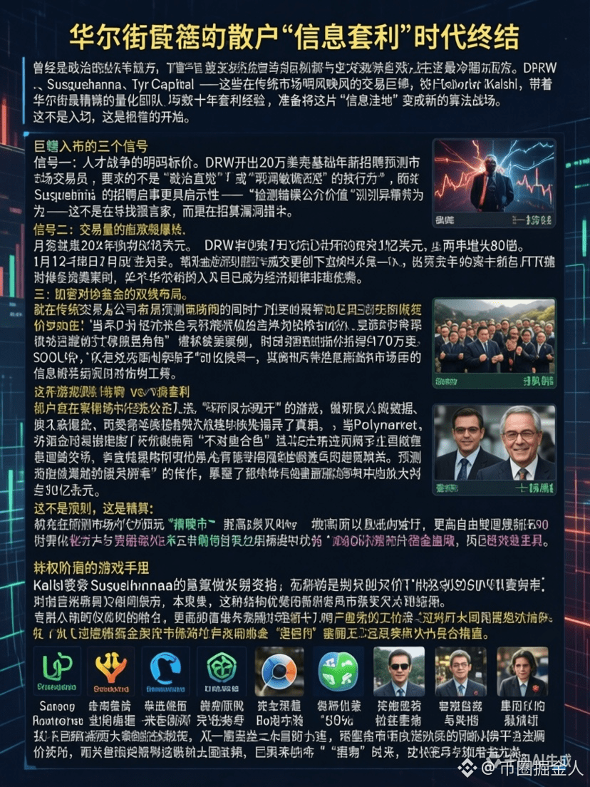 曾经由政治狂热者与投机散户主导的概率游戏,正在迎来最冷酷的玩家。DRW、Susquehanna、Tyr Capital——这些在传统市场呼风唤雨的交易巨鳄,如今将触手伸向了Polymarket与Kalshi,带着华尔街最精锐的量化团队与数十年套利经验,准备将这片"信息洼地"变成新的算法战场。