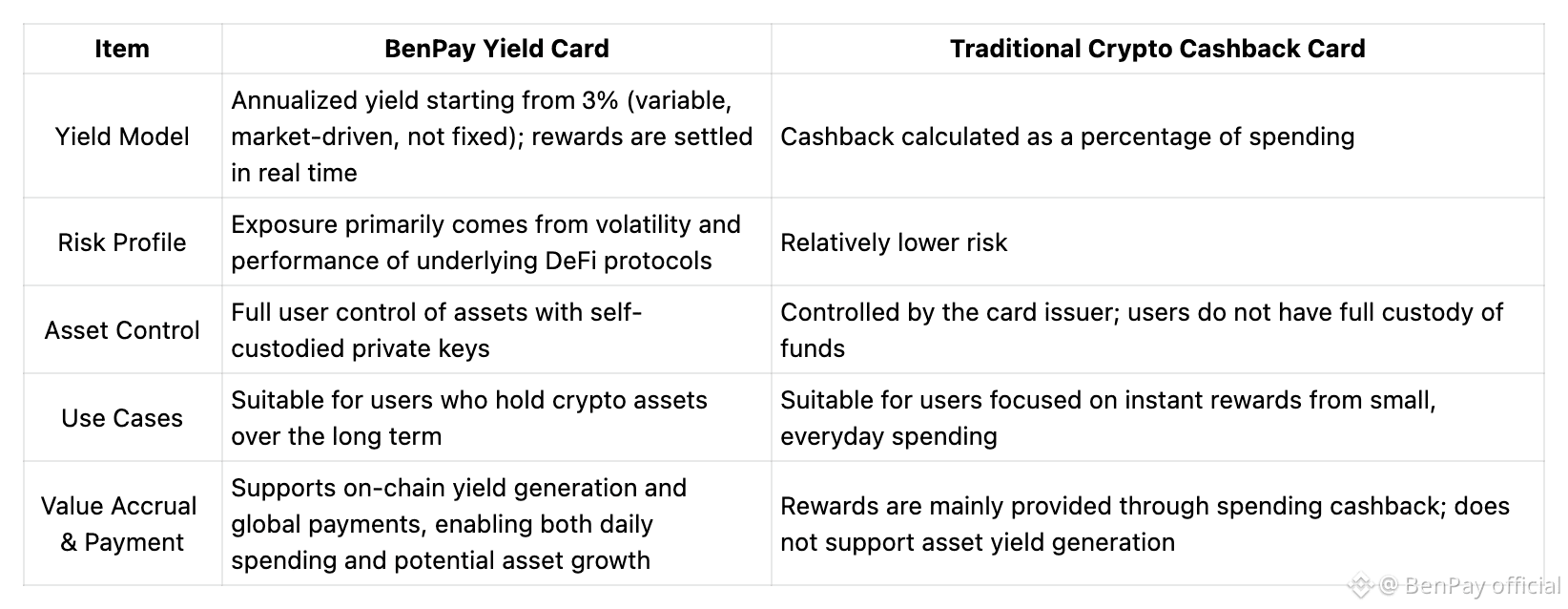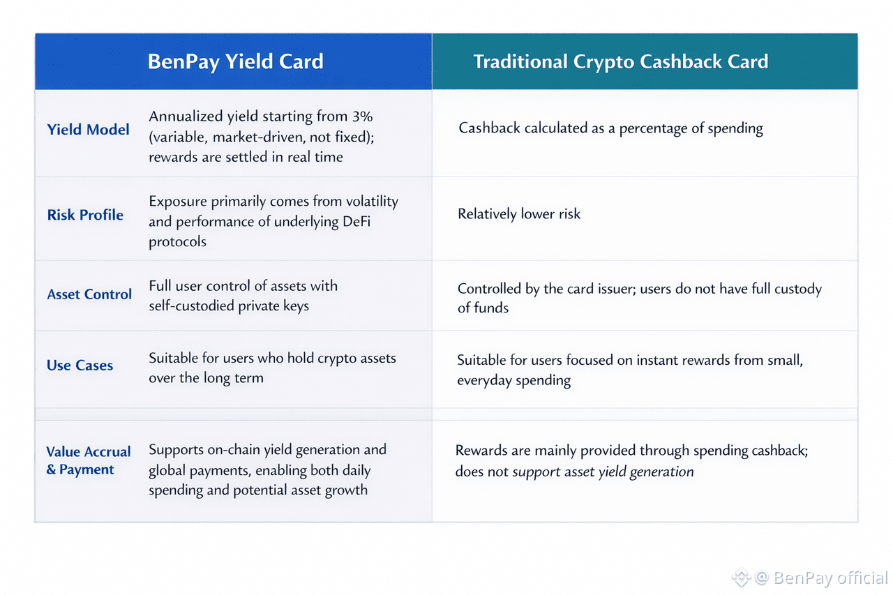 If you value asset ownership, on-chain transparency, and long-term asset efficiency, the BenPay Yield Card is likely the better choice.